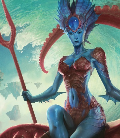 Kiora is a powerful merfolk planeswalker from Zendikar. She holds her home plane and her owner power above all others and is single-mindedly focused on saving Zendikar. To gain the power to save her home, she travelled to the plane of Theros and stole the bident of the sea goddess Thassa, which allows her mastery over the sea and its denizens. She is brash and haughty, her single goal of killing the titans leading her to rash action frequently.