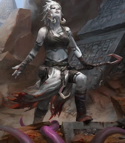 Leader of the Eternal Pilgrims, a group of cultist who worship Ulamog as a god and bring it sacrifices. She tricks Jace and Jori En and bring them to her cult.