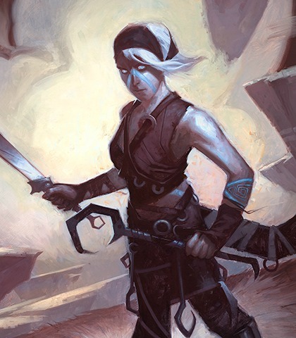 Tazri is the general of the allied forces on Zendikar, and a trusted advisor to Commander Gideon Jura. She wears a halo around her neck. She was instrumental in the recapture of Sea Gate from the Eldrazi titan Ulamog's brood. For much of the story she is dour and lacks confidence, due to a curse inflicted on her after killing an angel out of mercy. Over the course of the story, she breaks her curse and becomes a strong, confident leader.