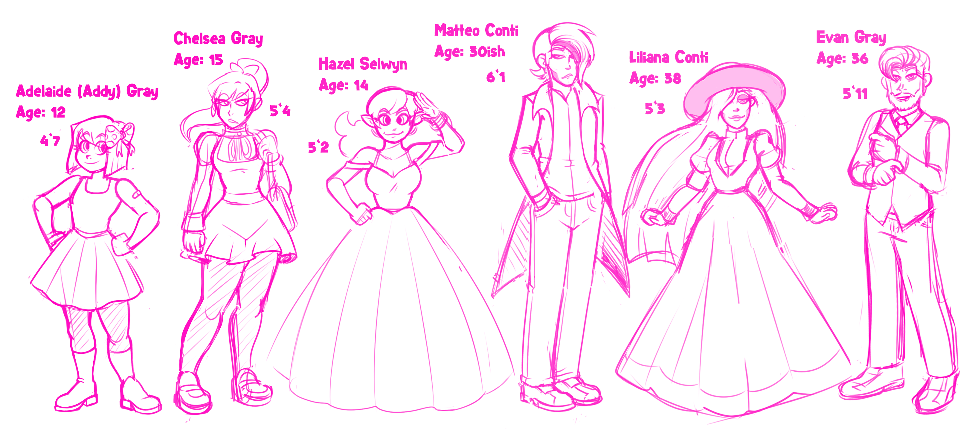 Here is a picture of the character lineup! Just a sketch, but working on full color, to be added soon!