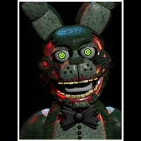 Demonic baby voice, similar to the original Springtrap voice. Unlike his game counterpart, which has yellow-green fur, this version of Springtrap resembles Glitchtrap's first form with completely green fur. In the virtual reality game, he wields a shiny knife used to attack the player. He seems to lack the corpse of Afton, being entirely mechanical. His eyes glow green when he spots the player, and he has a wide grin. A part of one ear is missing. According to Matt, his design was inspired by horror movies and serial killers in an attempt to immortalize him as a terrifying character. In the real world, he emerges out of Matt's body the size of an infant. He is covered with mucus and is also missing one ear. He is entirely organic and covered with fur.