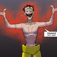 A rambunctious, exuberant, playful, troubled, highly tense, and sadistic big baby. Sounds and talks like an excited child entertainer; an effeminate silly clown. He has a very volatile temper, losing control of his anger at random and shouting a lot of voices. This makes him stutter several times, looking like failures. Feel free to audition the way you want and add the lines you find interesting for the character.