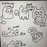 Hallow is Kitten’s/Cathrine’s cat, a being that likes to break laws of physics by fitting into basically anything. I plan for him to have deep and slightly unsettling monologues that one else can hear and every so often just a very deep “meow”
