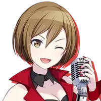 A VIRTUAL SINGER with chestnut hair in a short bob. Her signature outfit consists of a vibrant red crop top and a matching miniskirt. She's a well-balanced, exceptional singer with a warm, feminine voice.