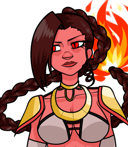 Vermilion is the Equil who puts a bounty on the head of the player. She's the Queen of the Equilibrium, and as such, does not communicate directly with the Equils. She is, however, not afraid to beat the crap out of the player if they get that far as to fight her. Her hair, and the fire on the tip, is the source of her energy. If the fire ever goes out, think of Charmander, except without death. Just weak.
