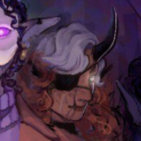 Harlow is 6'2 with dark tan skin, covered in black birthmarks. She has one horn which is broken, a missing eye covered by and eyepatch, and wears an elaborate tunic outfit.