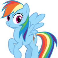 Rainbow Dash is a female Pegasus pony and one of the main characters in My Little Pony: Friendship is Magic. She maintains the weather and clears the skies in Ponyville.