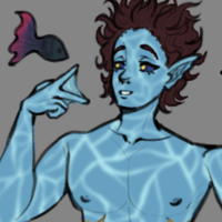 SIDE CHARACTER - A timid and paranoid spirit, he prefers staying in Graeme Forest and mind his own business. Usually called as Nick, he's a merman made out of water that swims around the unusual bodies of water in Graeme Forest. His past is still unknown. For reference of his voice, refer to Heizou from Genshin Impact but make it sound more meek and panicked.
