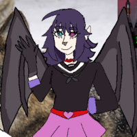 dark purple haired girl with rainbow socks, gray shoes, two different colored eyes one is blue one is purple, black shirt, what seems to be bat wings, a pink skirt and black gloves.