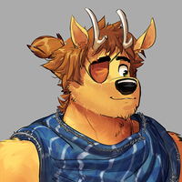 Being the clumsy one-eyed walking mountain he is, he's prone to apologizing for every little thing. He's bad with words too, and his tiny horns make getting the attention of any doe impossible, only making his insecurities bigger in exchange. He's very rural in his manners, and has a tendency to talk instead of thinking.