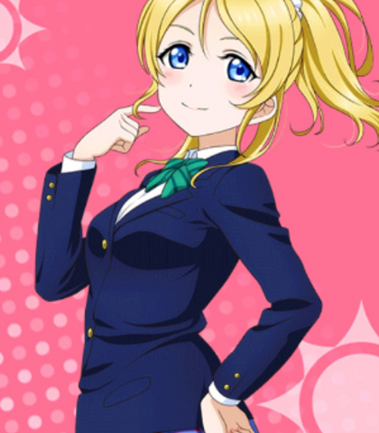 Bio:Eli is highly respected and well-known among the students, especially among her juniors. Unlike Nozomi, she appears rather stoic and skeptical in the early episodes, but it is shown that Eli is actually very kind and caring towards people who are close to her, like her little sister. She is also dependable as her grandmother entrusted her the responsibility of preventing the school from being shut down. Other than being admirable, Eli also has a lot of fans in the school. After she joined the group, their popularity rose and their ranking among the school idols increased, achieving more fame.(From LLSIP Wiki)