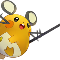 Dedenne is a small, round, orange mouse-like Pokémon, whose whiskers are in shape of antennas, which it uses to communicate with far-off allies. It has orange pouches on its cheeks that charge electricity, and its belly is a pale yellow. It has round black ears with light yellow insides, and a long black tail with a star-like tip. It has an aradicular tooth that can be seen on its upper jaw. Dedenne uses its upper whiskers to survey its surroundings. Its tail can absorb electricity from power plants or house outlets. It can then fire electricity from its lower whiskers.